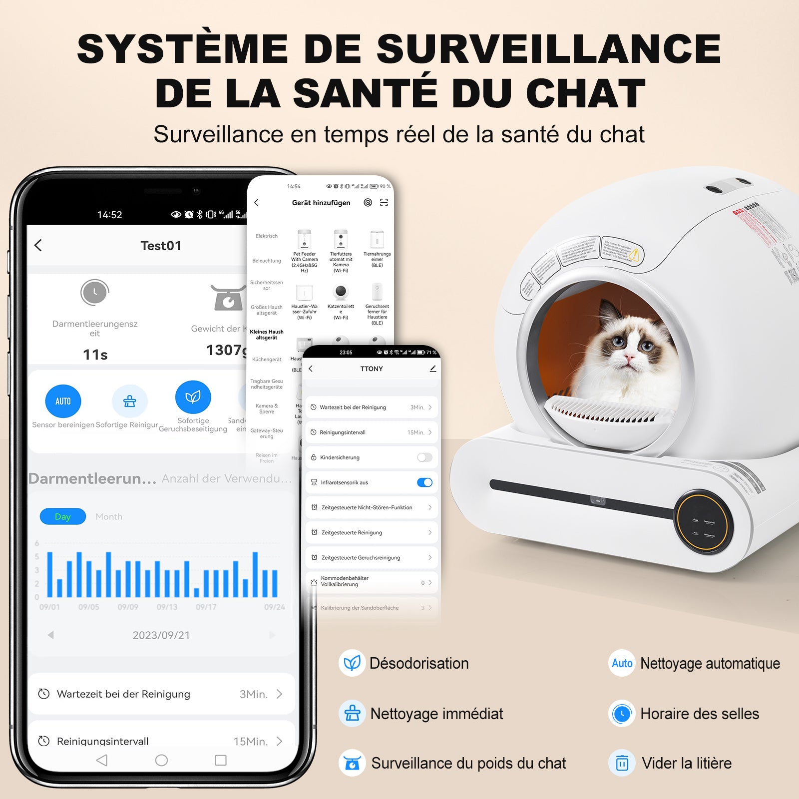 - KENNEN SIE IHRE KATZE: Zusätzlich zum Wechsel der Streu mit einem Klick, hilft Ihnen die App (nur Android/iOS) Fernbedienungsfunktion, Ihre Katze in Echtzeit zu überwachen, einschließlich Katzengewicht, Länge des Stuhlgangs. Sie können den Bericht über das Gesundheitsmanagement Ihrer Katze jederzeit einsehen.