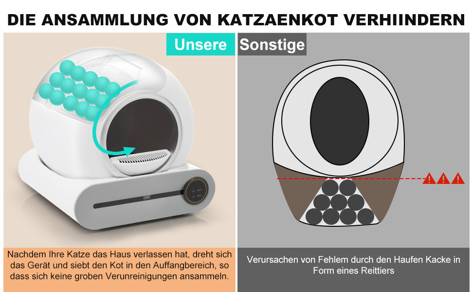 - MERKMALE, DIE SIE LIEBEN WERDEN: Automatisch/Smart/Sicher. Nach jedem Gebrauch reinigt sich die Katzentoilette automatisch, trennt die Streu von der sauberen und bewahrt sie im Streubeutel im Inneren der Trommel auf.